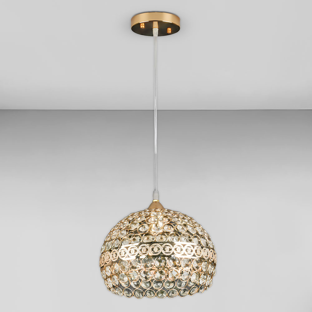 Современная компактная подвесная люстра на одну лампу, оснащена металлическим плафоном формы купола с хрустальными вставками: что обеспечит изысканный блеск и создаст интересную игру света и тени при включенном источнике света. Лучше всего эта люстра подойдет для освещения до 3 м² помещения, при использовании лампочек 6 Вт (LED) или 60 Вт (стандартная), будет актуальна для помещений с высокими потолками. Высота регулируется, что позволяет адаптировать подвес под разные пространства и потребности. Может применяться для локального освещения, или в качестве дополнительного источника света.