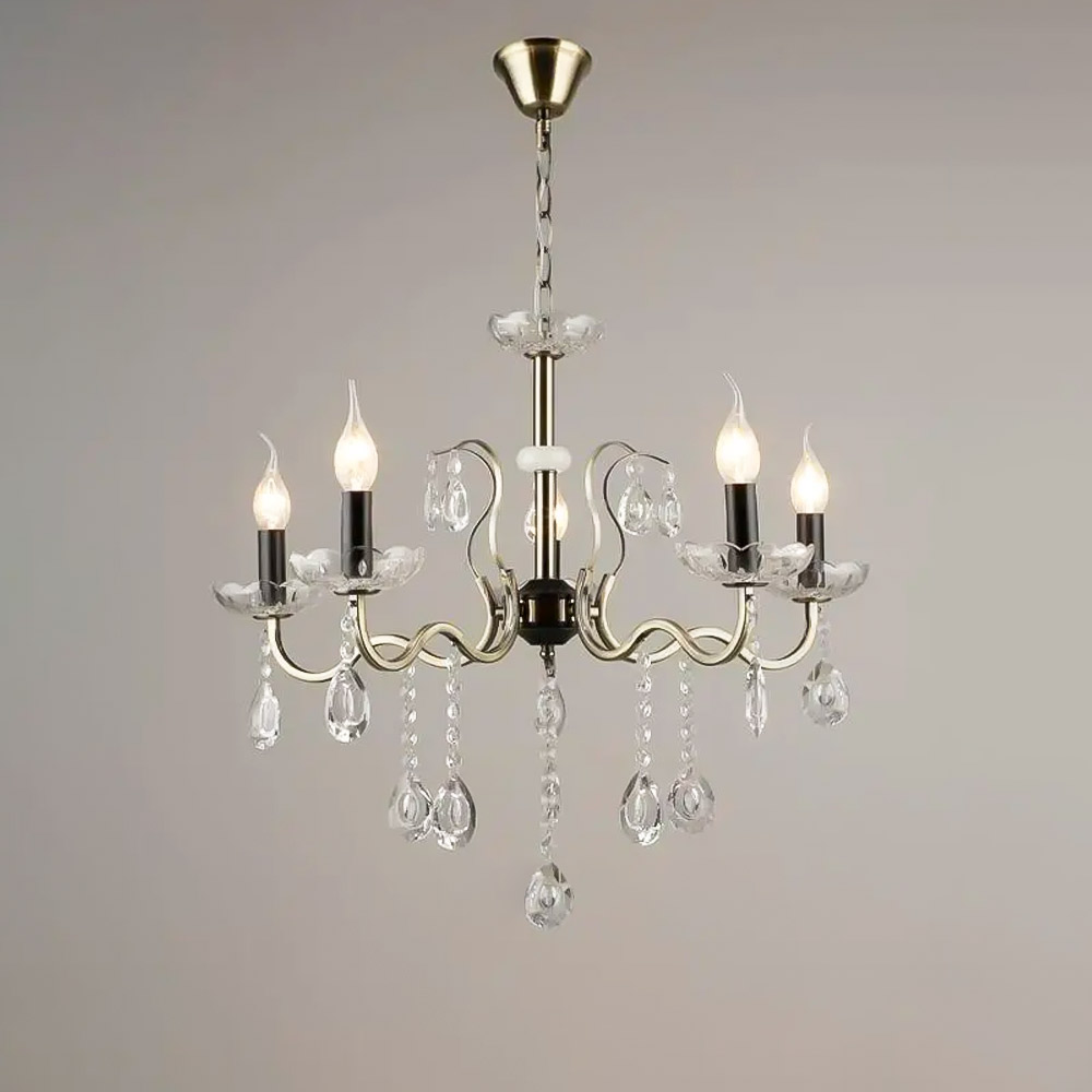 Классическая подвесная люстра на пять ламп в виде подсвечника с хрустальными подвесками.