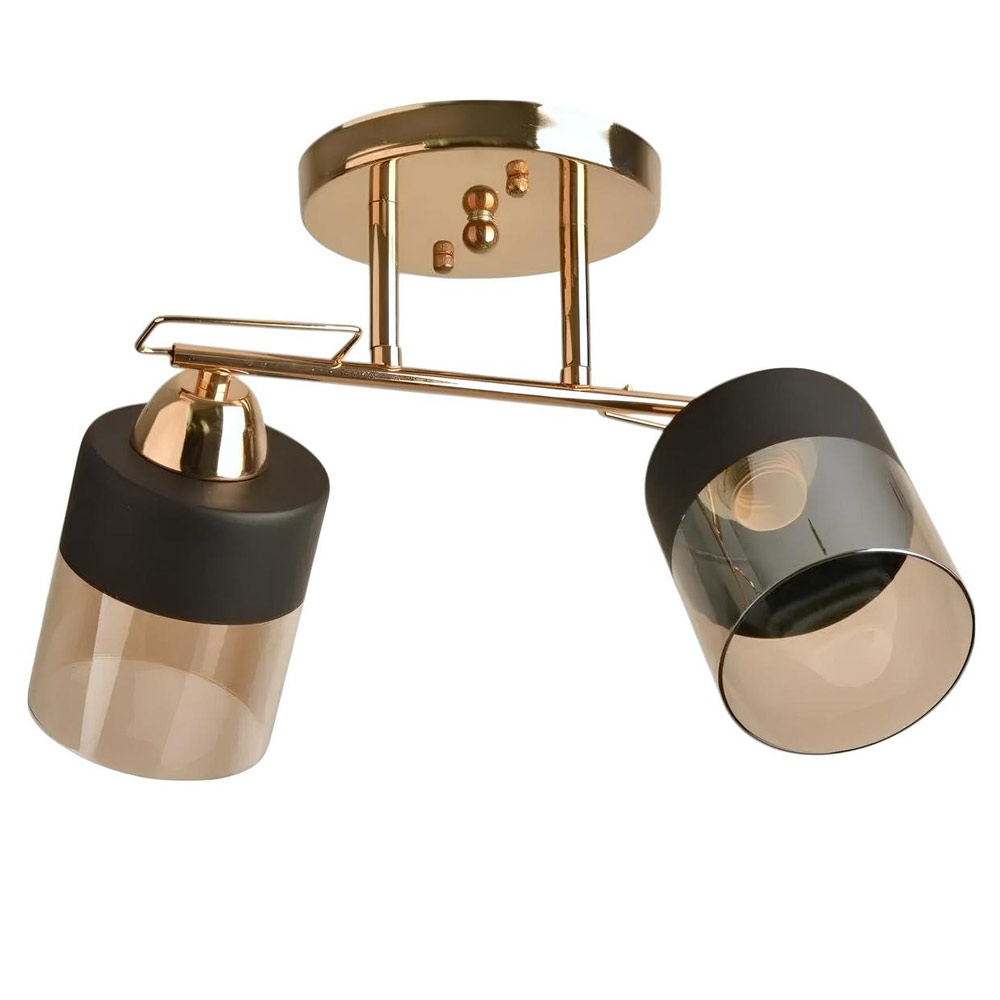 Потолочная люстра на две лампы со стеклянными плафонами. Плафоны двухцветные (черный + коричневый), имеют цилиндрическую форму.