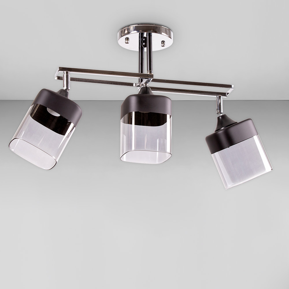 Потолочная люстра на три лампы со стеклянными плафонами формы прямоугольника со скругленными углами с поворотным механизмом.