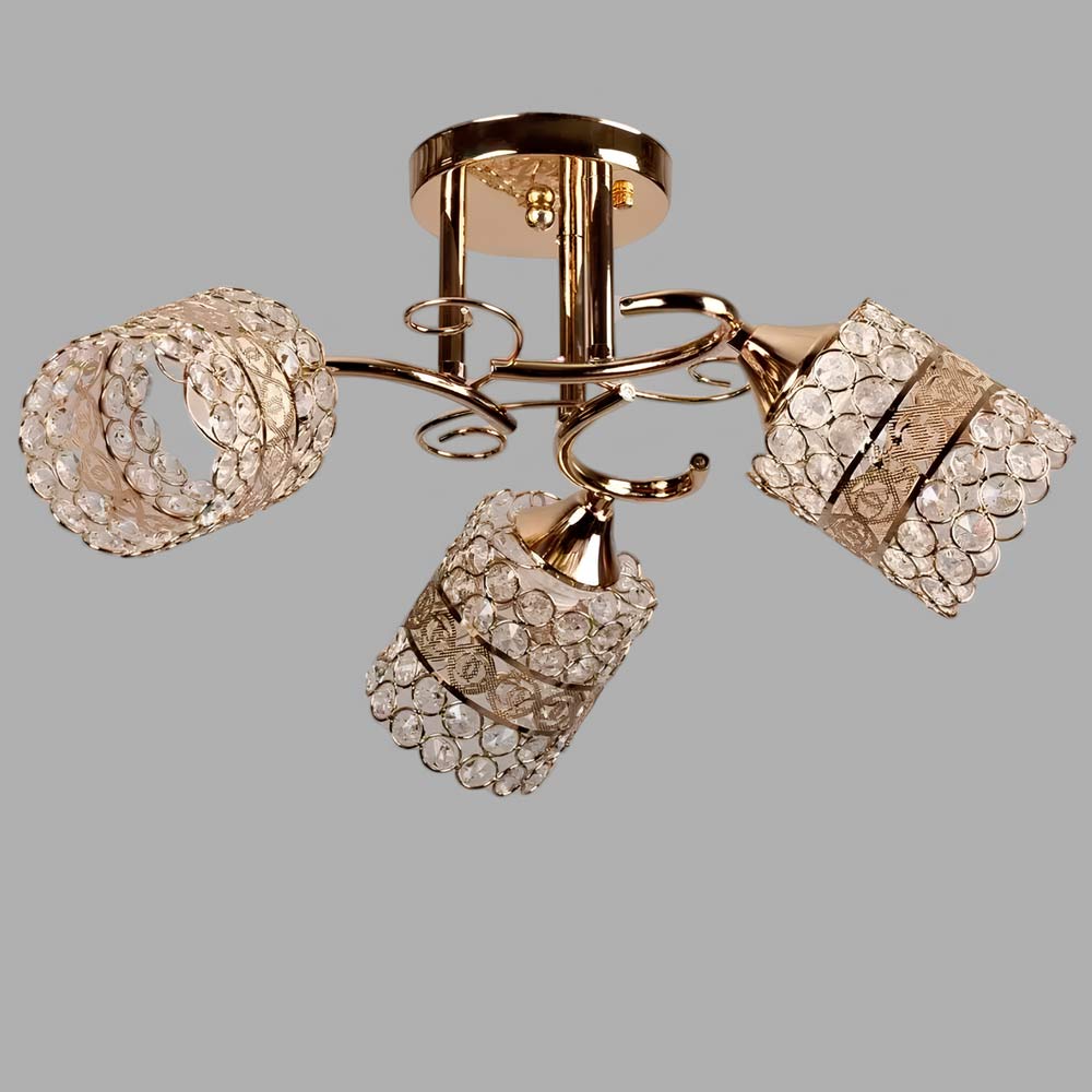 Современная потолочная люстра на три лампы, оснащена металлическими плафонами цилиндрической формы с хрустальными вставками: что обеспечит изысканный блеск и создаст интересную игру света и тени при включенном источнике света. Лучше всего эта люстра подойдет для помещений с общей площадью 9 м², при использовании лампочек 6 Вт (LED) или 60 Вт (стандартная), будет актуальна для помещений с невысокими потолками.