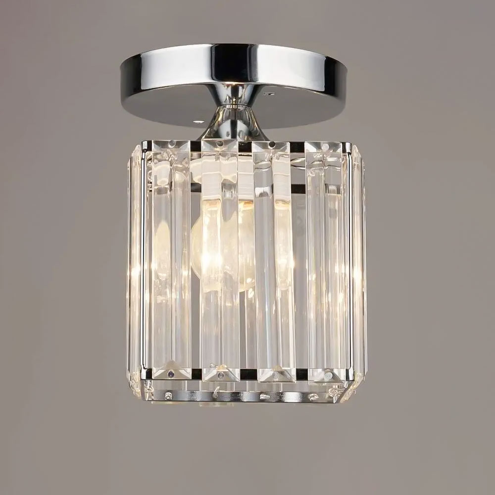 Стильная потолочная люстра на одну лампу со стеклянным плафоном прямоугольной формы с прозрачными подвесками.
