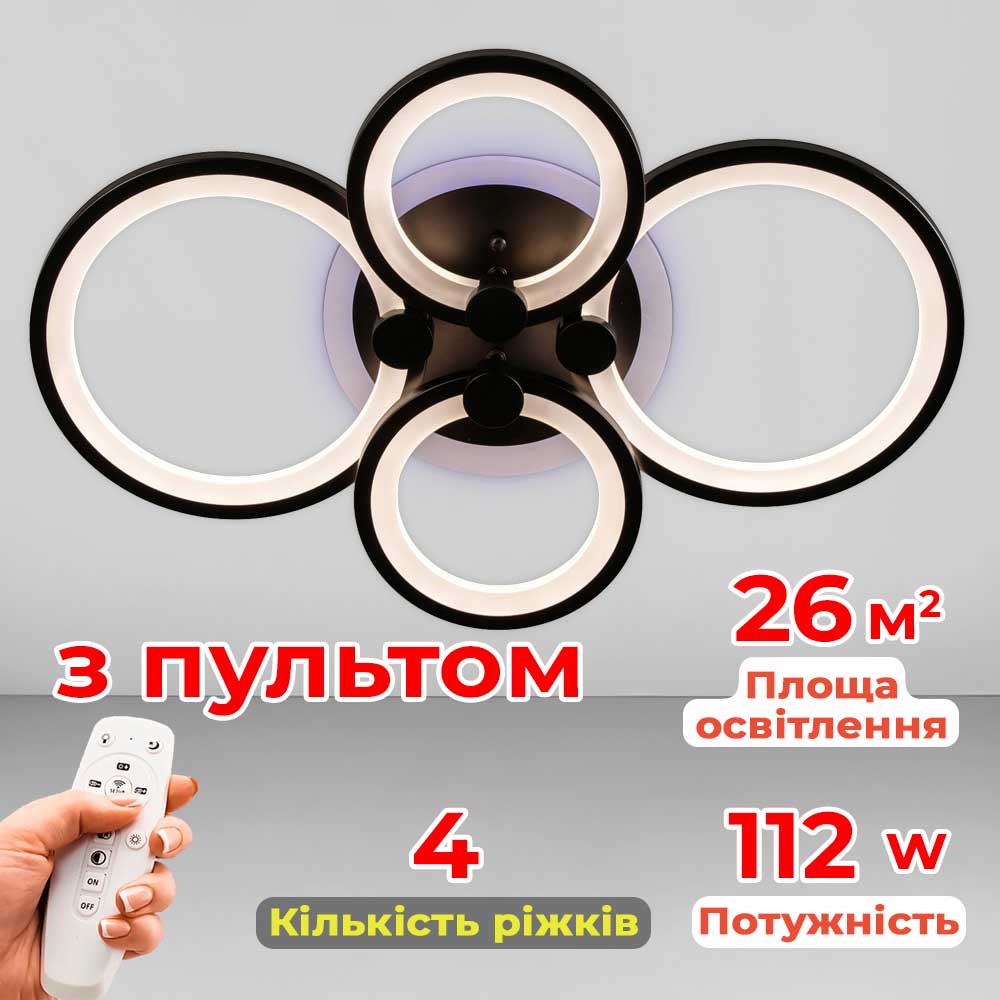 Потолочная светодиодная люстра в современном стиле, на четыре источника света в виде LED колец с диммером и RGB с подсветкой корпуса.