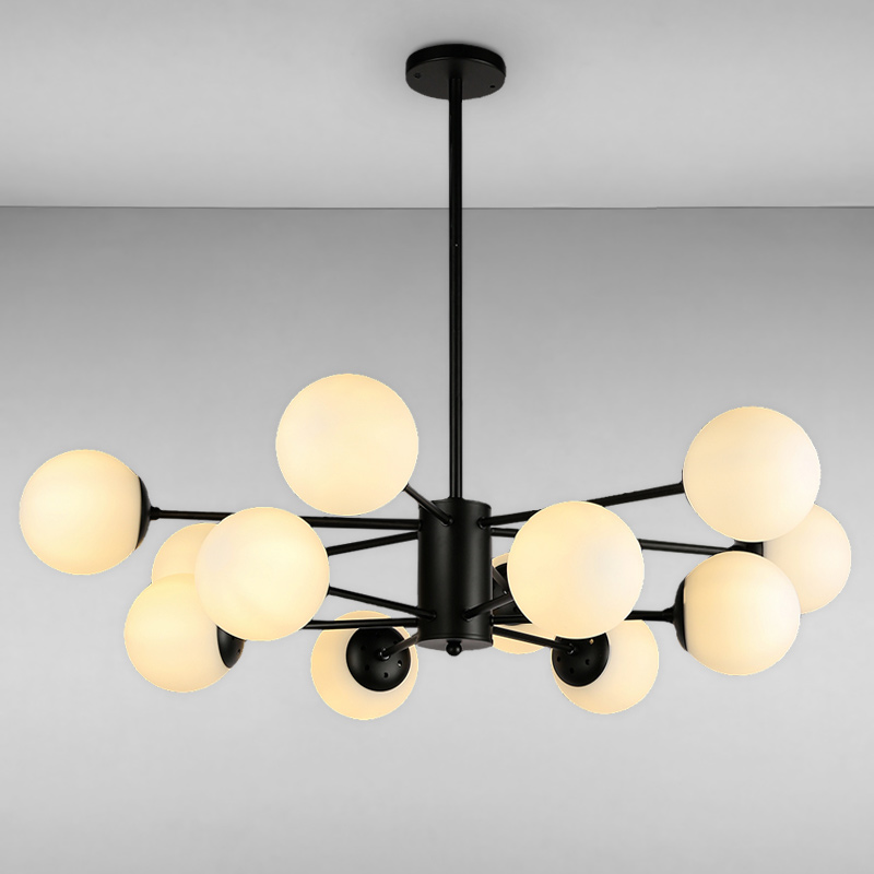 Люстра молекула на жорсткому підвісі на дванадцять ламп з плафонами у формі кулі.