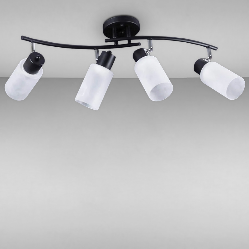 Стельові люстри на чотири лампи з поворотними плафонами у формі циліндра.
