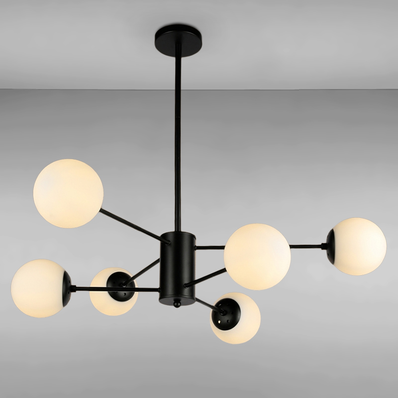 Люстра на шесть ламп в стиле модерн из черного металла и круглых стеклянных плафонов белого цвета.