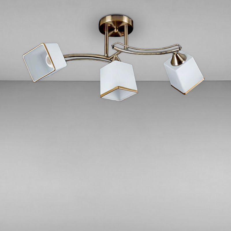 Стельові люстри на три лампи з плафонами прямокутної форми.