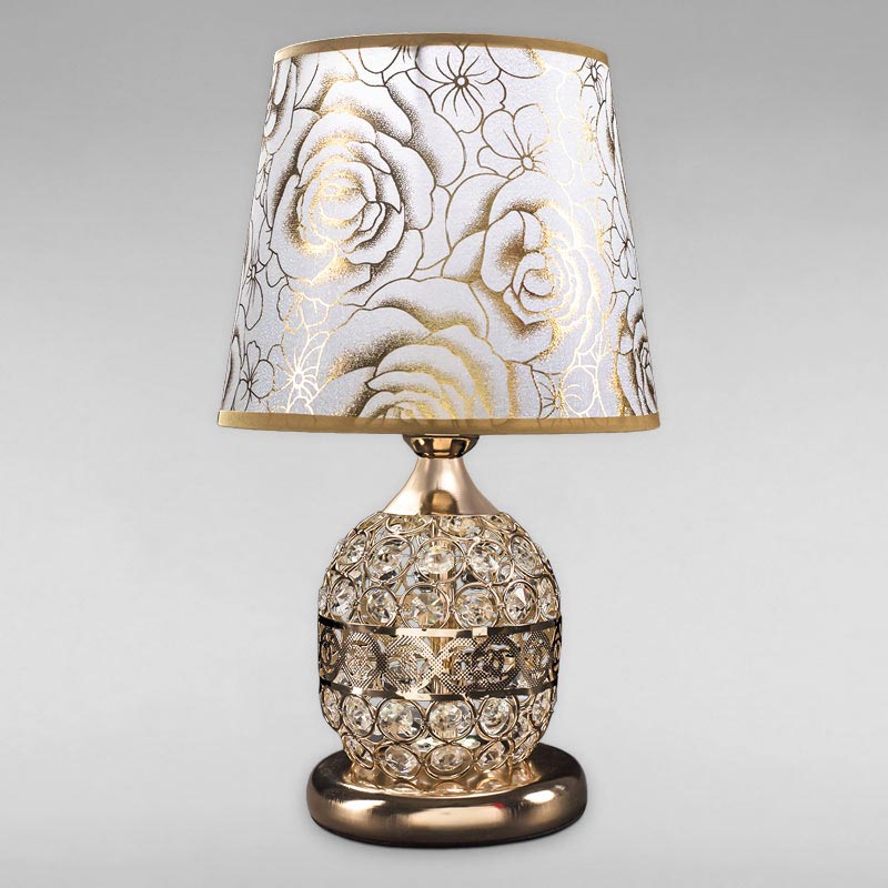 Декоративна настільна лампа на одну лампу з тканинним абажуром і корпусом з кришталевими елементами. Настільна лампа має LED підсвічування всередині корпусу.